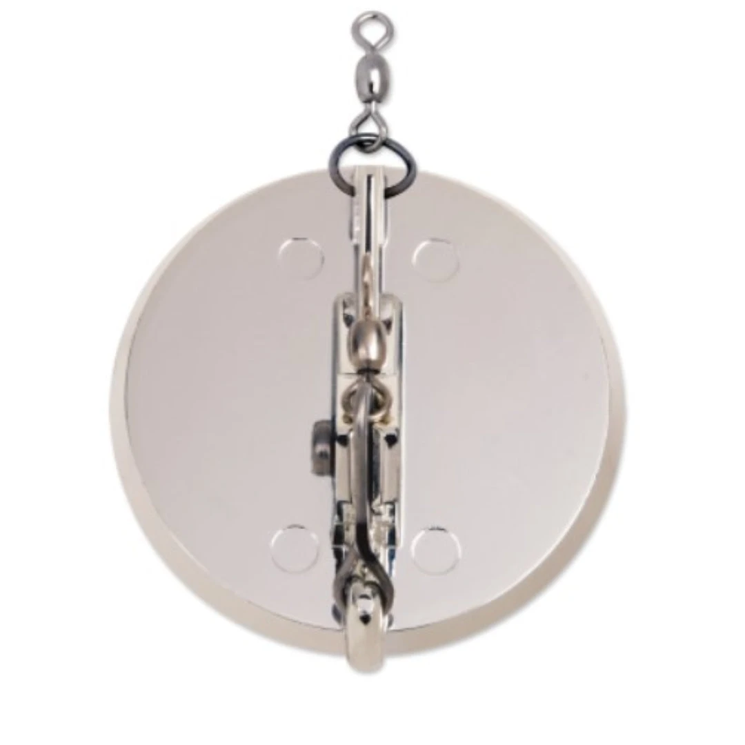 The special round shape and resulting multi-directional feature sets the Dipsy Diver® apart from all other divers and planers. A shift left or right, as indicated on the base plate, will cause the diver to track to port or starboard, allowing for large spreads of lures to be fished from a single boat. You’ll cover more water when the Dipsy Divers are deployed. The adjustable trip mechanism can be set specifically for various lure sizes and the size of target fish. Four sizes of Dipsy Divers are available, with dive depths of up to 20, 35, 50 and 100 feet. See our Tech Report: Dipsy Diver, The Directional Diver and Tech Report #15: Trolling Spoons for Freshwater Salmon, Striped Bass, Trout.